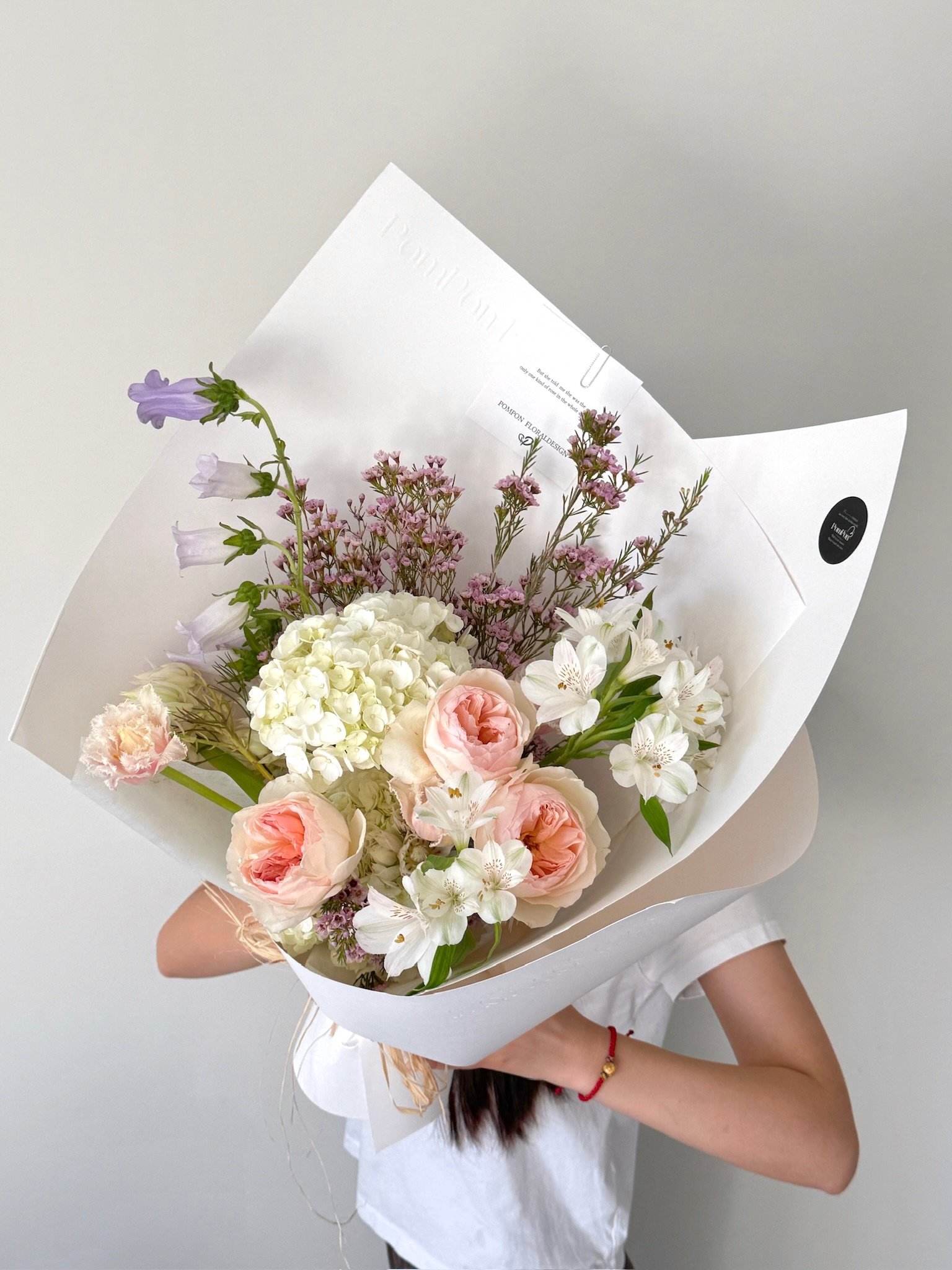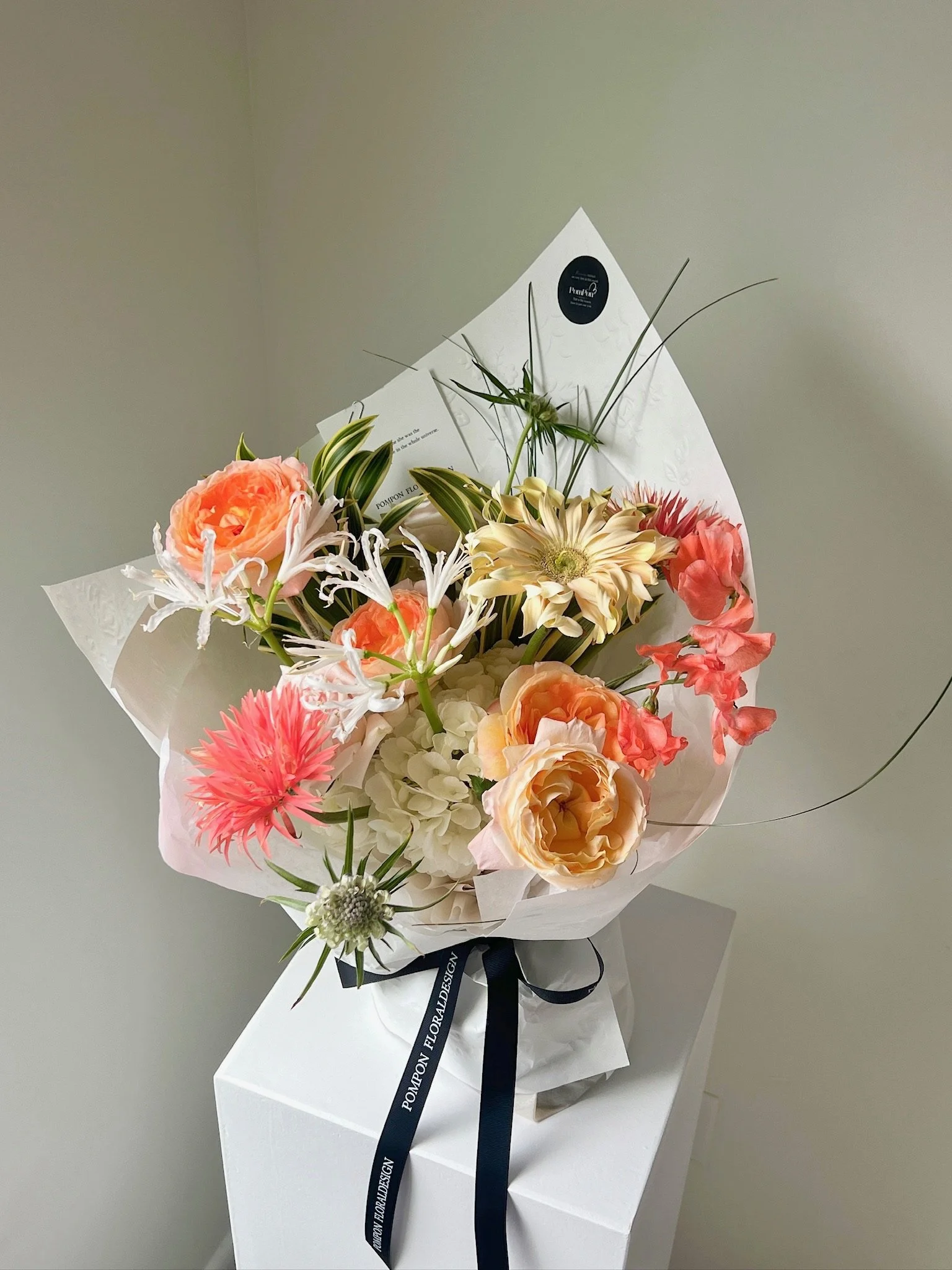 • The bouquet will be designed with seasonal exotic flowers to bring you the beauty of nature in four seasons. All arrangements are one-of-a-kind and unique.